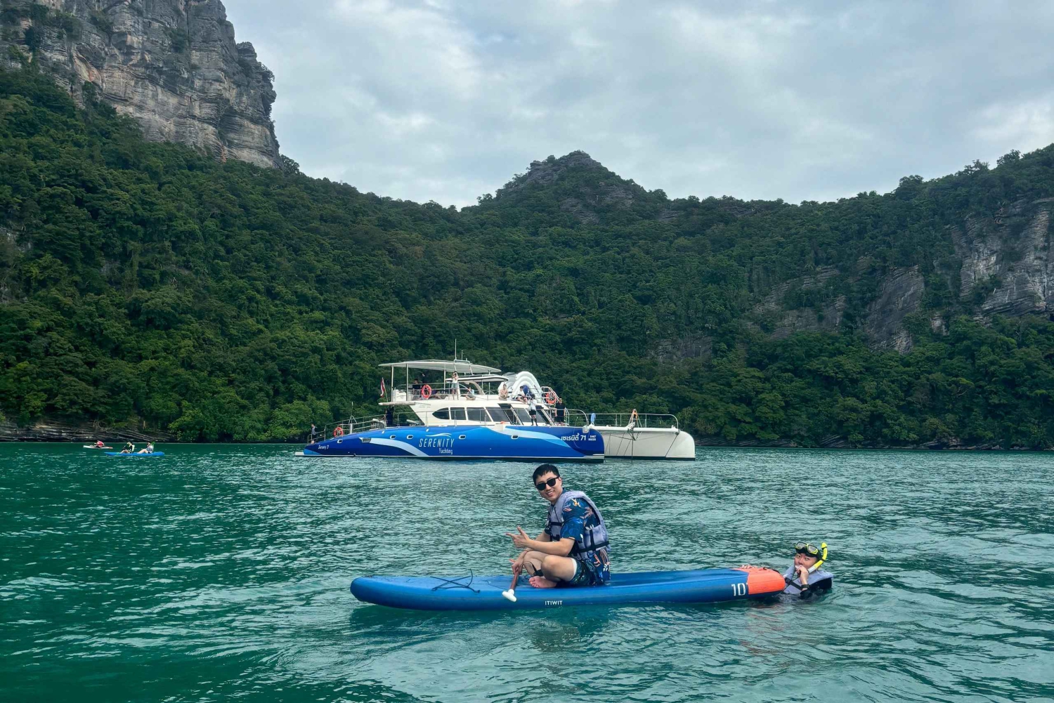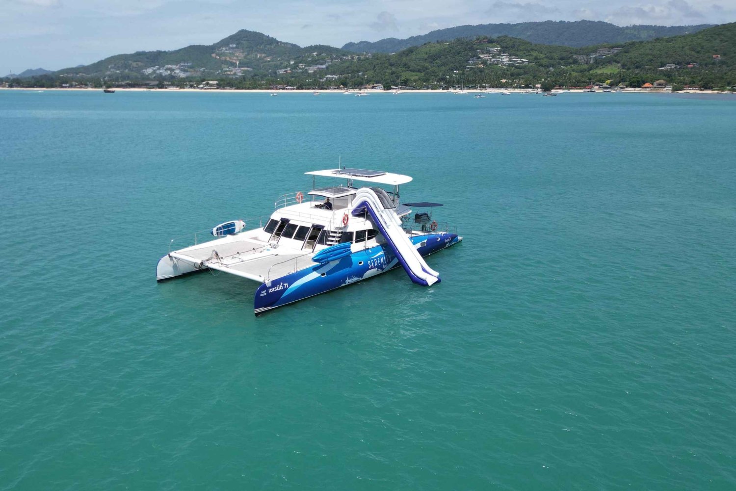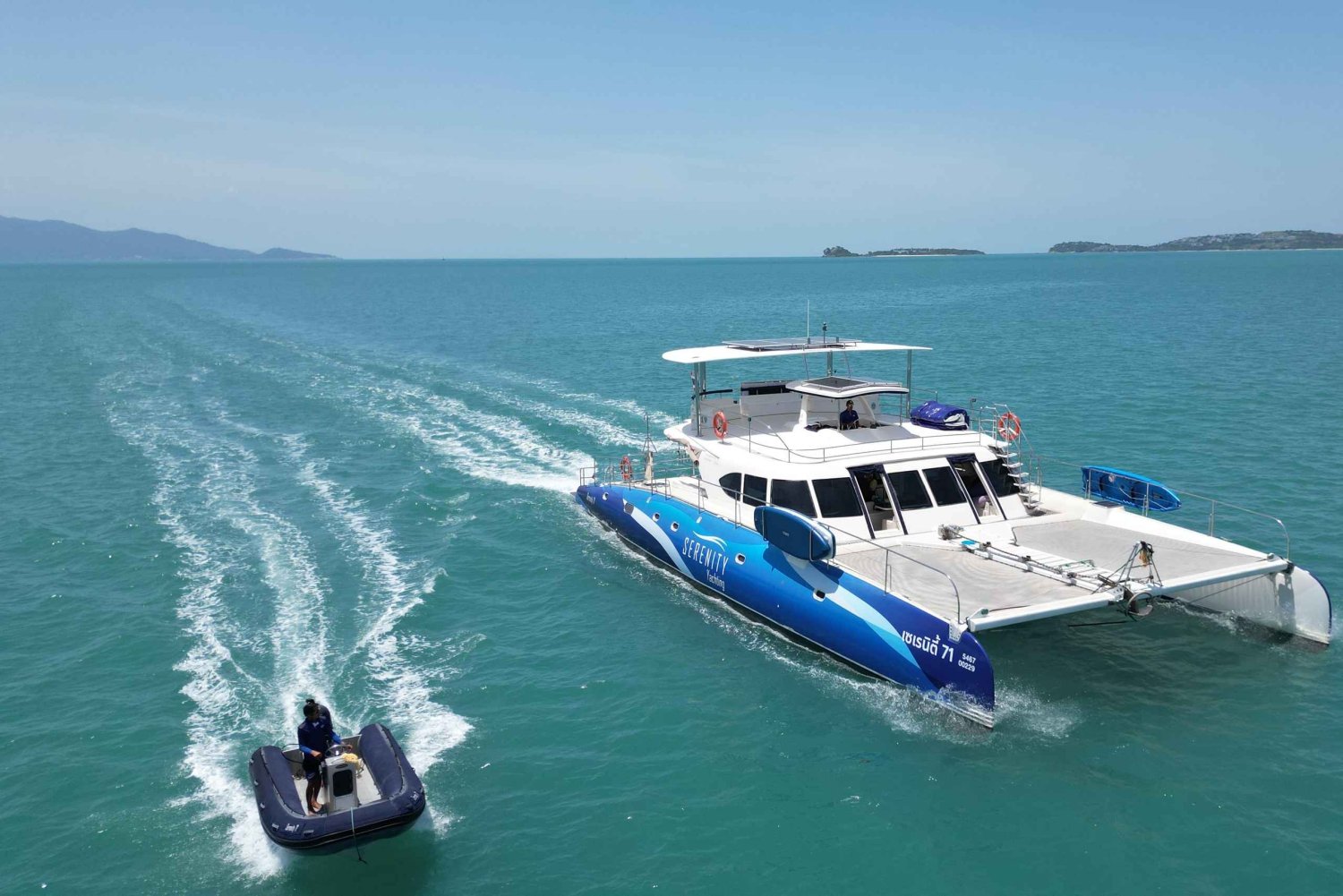 Únete a Serenity Yachting para una excursión inolvidable, donde la aventura, la relajación y el servicio de primera clase se unen para un día perfecto en el mar. Navega por las impresionantes aguas que rodean Koh Samui o Koh Phangan y disfruta de una variedad de actividades que incluyen snorkel, pesca y kayak. Prueba suerte pescando peces locales con el equipo que te proporcionamos. Deslízate por aguas cristalinas y lagunas escondidas en kayak o paddleboard. Disfruta de un emocionante chapuzón directamente desde el barco en un tobogán acuático. Relájate en playas de arena blanca o toma el sol en la cubierta con unas vistas impresionantes. Saborea un delicioso bufé o una barbacoa de marisco con frutas tropicales frescas y bebidas. Disfruta de una romántica puesta de sol en el mar con una copa de vino en la mano.Includes