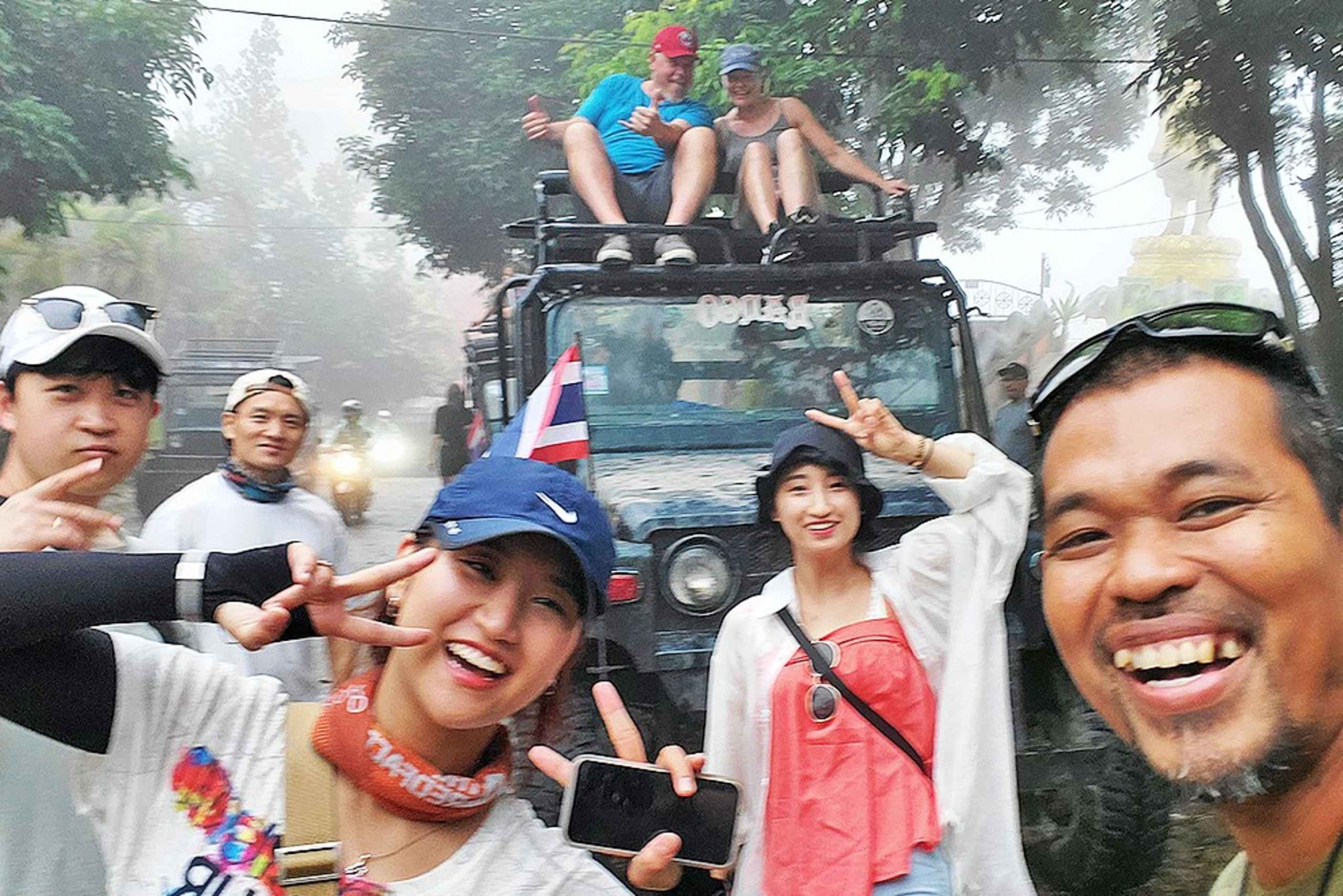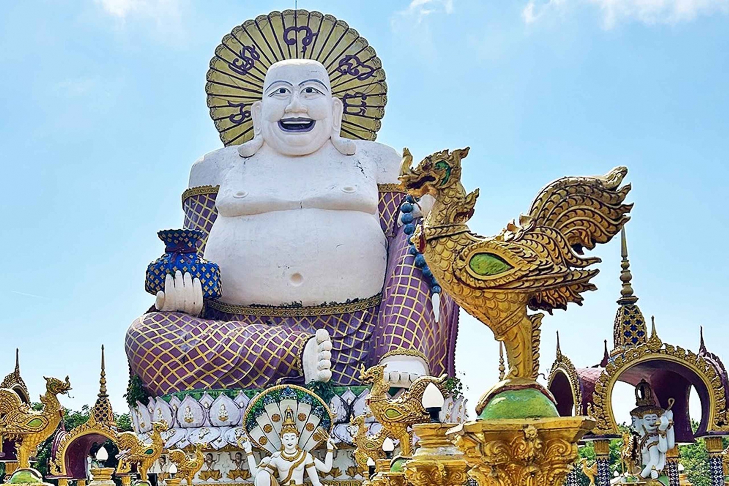 Pick-Up We will pick you up in an open off-road jeep between 8:30 a.m. and 9:45 a.m. at your specified accommodation, and then guide you to the first stop of the trip, in the south of Koh Samui. Hin Ta & Hin Yai The first stop of today's exciting jungle safari is at Grandfather and Grandmother's Rock in the south of the island. It represents a bizarre rock formation that is reminiscent of the male and female sex. You will then find out more information or the prehistory of its origins on-site from our multilingual, trained tour guides. Guan Yu The Guan Yu Shrine, on the main road in the south of Koh Samui between Lamai and Hua Thanon, is a 16-meter bronze war statue that was built by a Chinese islander to celebrate Chinese heritage in 2016. It is a really impressive temple complex, with small souvenir stands and restaurants in the entrance area Mummified monk A special insight into Thai culture is the mummified monk Luong Pordaeng. He died in 1973 in a meditative sitting position. The body of the deceased, who has died for over 30 years, shows hardly any signs of decay and is on display in a glass display case in the temple Wat Khunaram in the south of the island. Waterfall The next stop is at one of the most spectacular waterfalls in Na Muang, where you can swim and relax at the waterfall. It is one of the few waterfalls on Koh Samui that has sufficient water all year round. The picturesque, tropical setting is unique and has been used for filming several times. Lunch From here it goes on into the mountains of Samui. With our 4x4 off-road jeep, we take you to one of the beautiful mountain restaurants with a breathtaking view of the coconut island of Koh Samui. Here you will be served a delicious, extensive lunch and water. There is guaranteed something for every taste. Magic garden Saturated, rested and relaxed we will drive up to 600 meters above sea level. A visit to the unique magic garden in the mountains of Koh Samui. The creative stone sculptures, figures and other objects exhibited there were hand-carved and tapped in 1976 by the 77-year-old owner. Highest point It goes even higher. The highest point of the island is at the well-known observation deck and temple Wat Teepangkorn at 635 meters. From here you have a breathtaking 360-degree view of the island. Wat Plai Laem The Wat Plai Laem is the largest Buddhist temple complex in Samui and shows Guanyin, the goddess of mercy and compassion. Here you will get an insight into Chinese-Thai beliefs as artistic Buddhist themes and architecture. The temple and the art techniques used to create it are centuries old and based on old beliefs. Big Buddha The 12 meters high Big Buddha was opened in 1972 and is the symbol of Koh Samui. It is located in the northeast of Samui on a small island (Koh Fan) which is connected to Samui by a bridge. Drop-Off Around 5:00 p.m. we will drive through the bush trail, and then guide you back to the accommodation you have deposited.Includes