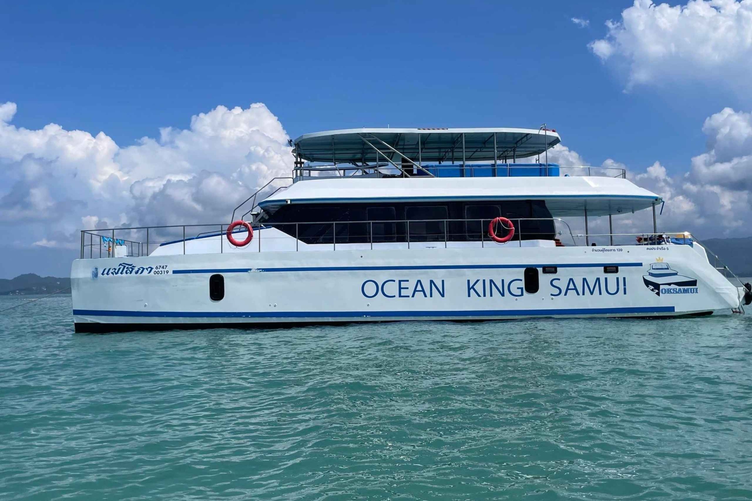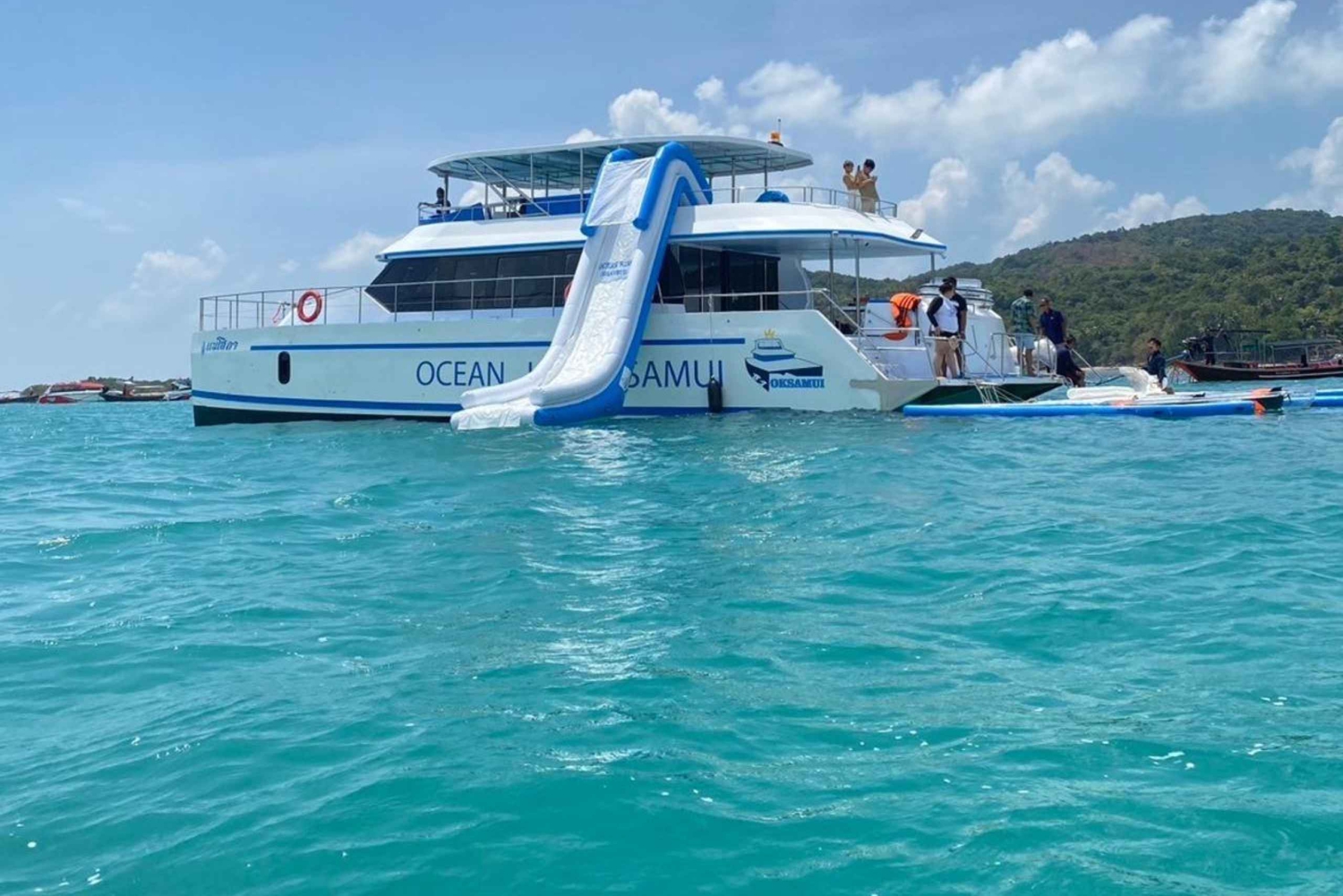Your island adventure starts with seamless hotel pickup, whisking you directly to Bang Kao Pier. Step aboard our spacious premium catamaran and set sail across the Gulf of Thailand toward two of Koh Samui's most spectacular destinations. First, discover Pig Island (Koh Madsum), one of the region's most sought-after attractions. Meet the island's famous resident pigs as they wade through the shallow waters, explore pristine white-sand beaches, and capture stunning photos in this unique tropical setting. Continue to Koh Tan, renowned for its exceptional snorkeling conditions. Immerse yourself in crystal-clear waters teeming with vibrant marine life and colorful coral formations. Prefer to stay above water? Take advantage of our complimentary paddleboards and water slides, or simply relax on deck. Midway through your journey, savor a freshly prepared light meal featuring authentic Halal-certified Thai specialties and seasonal tropical fruits—all served with panoramic ocean views from the comfort of our catamaran. Select the timing that suits you best. The morning departure offers a more tranquil experience with fewer crowds and calm waters. The afternoon option delivers the added bonus of spectacular sunset views as you return to shore. Every detail is covered: professional captain and crew, premium snorkeling equipment, life jackets, unlimited drinking water, full travel insurance, and round-trip transfers. You simply show up and enjoy. Ideal for families, snorkeling enthusiasts, and travelers seeking a well-organized island-hopping experience without the typical hassles. With our commitment to safety, comfort, and authentic Thai hospitality, you'll experience the best of Koh Samui's island treasures in a single unforgettable day.Includes