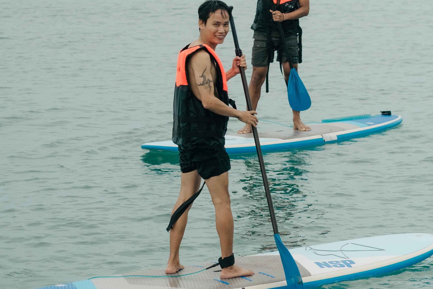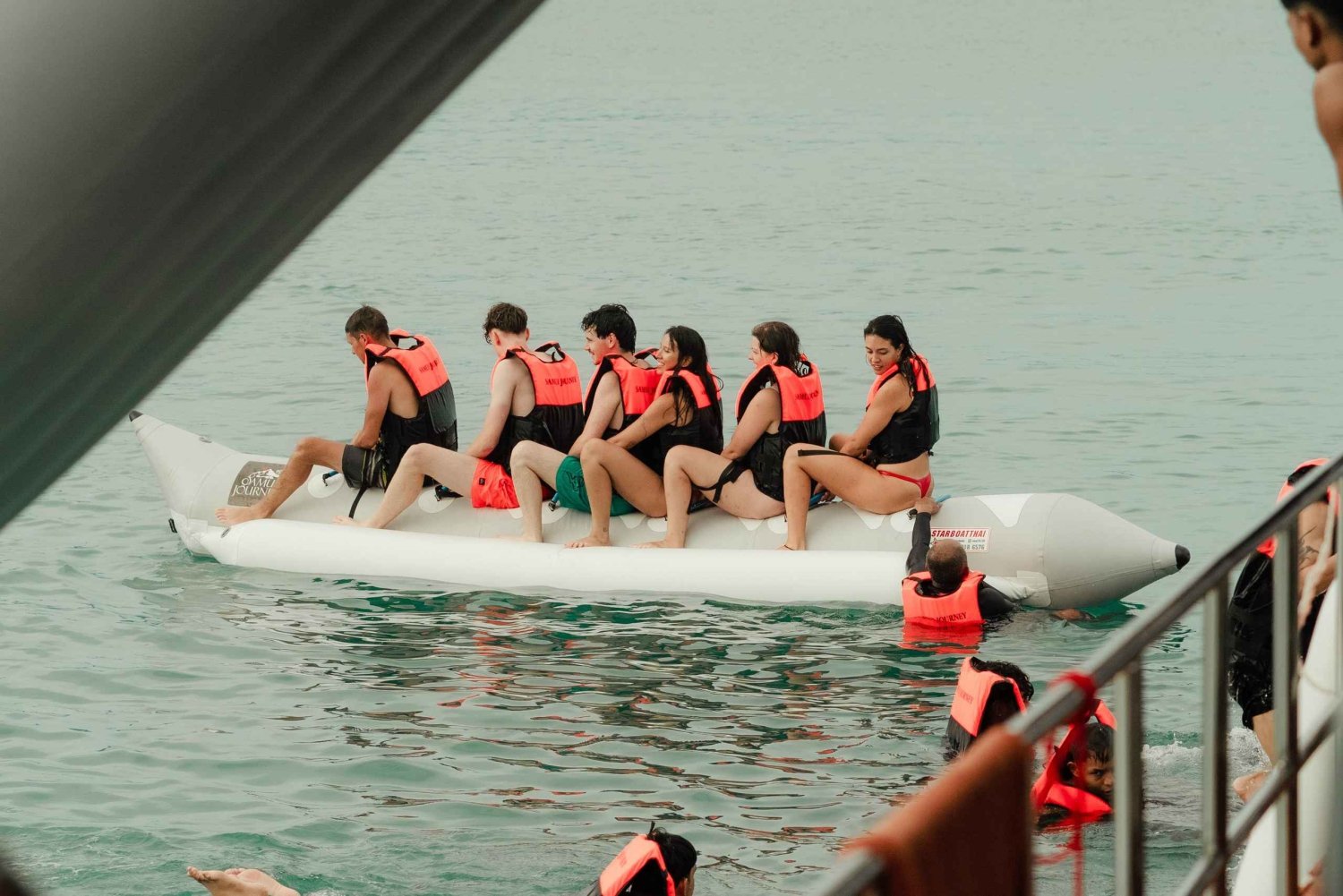 Begin je reis met een handige ophaalservice bij je hotel en ga naar de pier. Stap aan boord van een VIP 4-motorige glasvezel catamaran, uitgerust met alle comfort, inclusief een toilet aan boord en zelfs een Thaise massageservice. Ga naar Koh Madsum (Varkenseiland) voor een unieke en hartverwarmende ervaring. Interacteer met, voer en maak schattige selfies met de beroemde inwonende varkens. Vertrek vanaf Koh Madsum en glijd over turquoise wateren. Duik in kristalhelder water vol levendige koraalriffen en exotisch zeeleven bij Koh Tan. Gebruik snorkeluitrusting van topkwaliteit voor een meeslepende ervaring. Hou je vast voor een spannende, lachende rit over de golven op een bananenboot. Omarm de rust met gratis paddleboards en kajaks. Glijd moeiteloos over kalme baaien en ontdek verborgen baaien. Geniet van een heerlijke, authentieke Thaise lunch met gratis drankjes (cocktails, frisdrank, water) terwijl je geniet van het panoramische uitzicht op de oceaan. Bewonder vervolgens de dramatische kalkstenen karsten van 'Koh Si Koh Ha, (Vijf Eilanden)', een adembenemend natuurwonder. Met een erkende kapitein met meer dan 10 jaar ervaring, professionele Engelstalige gidsen, retourtransfers naar het hotel en uitgebreide reisverzekering, zijn je comfort, veiligheid en plezier gegarandeerd.Includes