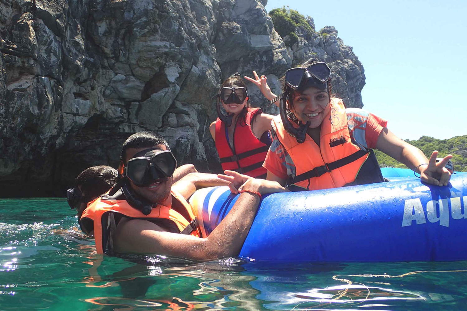 Ta wycieczka jest przeznaczona dla gości, którzy wolą unikać tłumów. Ciesz się wyjątkową wycieczką, która jest ekscytująca, elastyczna i interesująca. Plan zwiedzania zostanie dostosowany do Twoich preferencji i może zostać zmodyfikowany w dowolnym momencie. Zostaniesz odebrany z hotelu między 8:30 a 9:15 i udasz się na nabrzeże rzeki. Rozpocznij podróż w kierunku Pięciu Wysp. Wyspy te kryją w sobie tajemnicze i rzadko spotykane zjawiska, takie jak zbieranie ptasich gniazd. Popłyń do Parku Narodowego Mu Ko Ang Thong i delektuj się pysznymi przekąskami podczas rejsu. Poznaj wspaniałą scenerię Zatoki Tajlandzkiej, w której żyją delfiny i wieloryby. Popłyń na północne wyspy Koh Wao. Twój profesjonalny lider snorkelingu zabierze Cię w podróż do podwodnego świata parku morskiego. Kontynuuj rejs na południe do Koh Tai Plao, aby odkryć jaskinie, ukryte laguny i białe piaszczyste plaże. Będziesz mieć możliwość wybrania się na wycieczkę z przewodnikiem kajakiem morskim wzdłuż wybrzeża, aby odkryć rewelacyjne klify i magiczne tunele. Odwiedź zaciszne plaże i ciesz się czystymi, spokojnymi wodami. Zjedz pyszny lunch podczas podróży obok najciekawszych wapiennych wysp parku narodowego, które wynurzają się z morza w dziwacznych formacjach skalnych. Po lunchu dotrzesz na wyspę Emerald Lake. Wspinaj się przez gęste lasy deszczowe i wąskie wąwozy, aby zobaczyć piękny punkt widokowy z widokiem na okoliczne wyspy. Wybierz się na spacer do ukrytego słonowodnego jeziora całkowicie otoczonego ścianami, nazywanego Błękitną Laguną. Popłyń z powrotem na Koh Samui i podziwiaj wspaniałe widoki na zachód słońca. Dotrzesz do przystani około godziny 18:15, a stamtąd zostaniesz przetransportowany z powrotem do hotelu.Includes